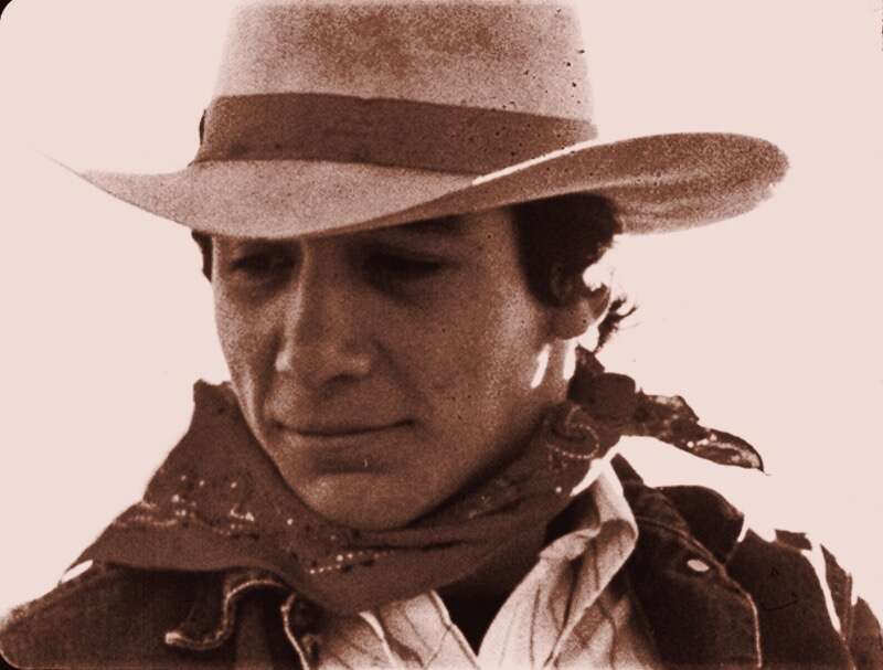 From inception through the final editing process, along with his starring role Johnny lent his imaginative and innovative abilities to the production in a multitude of other ways, although uncredited. Besides coming up with the film’s title, Johnny contributed ideas to the screenplay, improvised dialogue and suggested shooting locations. This included the scenic backdrop of Thousand Oaks, CA for the movie’s finale where many westerns had been shot, such as Johnny’s Emmy-nominated role on The Rifleman. For the crucial ending sequence where he rides off across the prairie with Kristin Nelson, Johnny suggested and gave instruction to the student filmmaking team on a dreamlike special effects technique. This involved turning the camera upside down while filming Kristin getting off Johnny’s horse before reversing the film inside the camera so that she appears to gently float up onto it. Along with Johnny and Kristin, this final segment co-starred Johnny’s own pinto horse, Two Bits, he’d been gifted with at age 13. Other contributions Johnny made to Broncho Billy include his vocal harmonies over the end credits to the film’s theme song. Later Johnny supervised cutting the film negative with a professional negative cutter that he and his father, film editor Robert Crawford, Sr. were acquainted with.